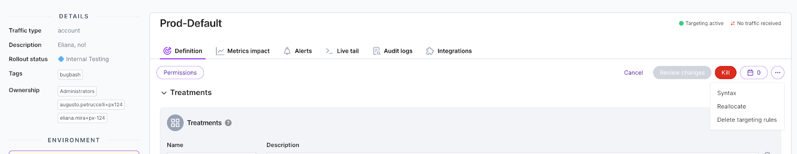 - During the release, a critical issue is found and the feature flag is immediately killed, sending all customers to the default treatment.