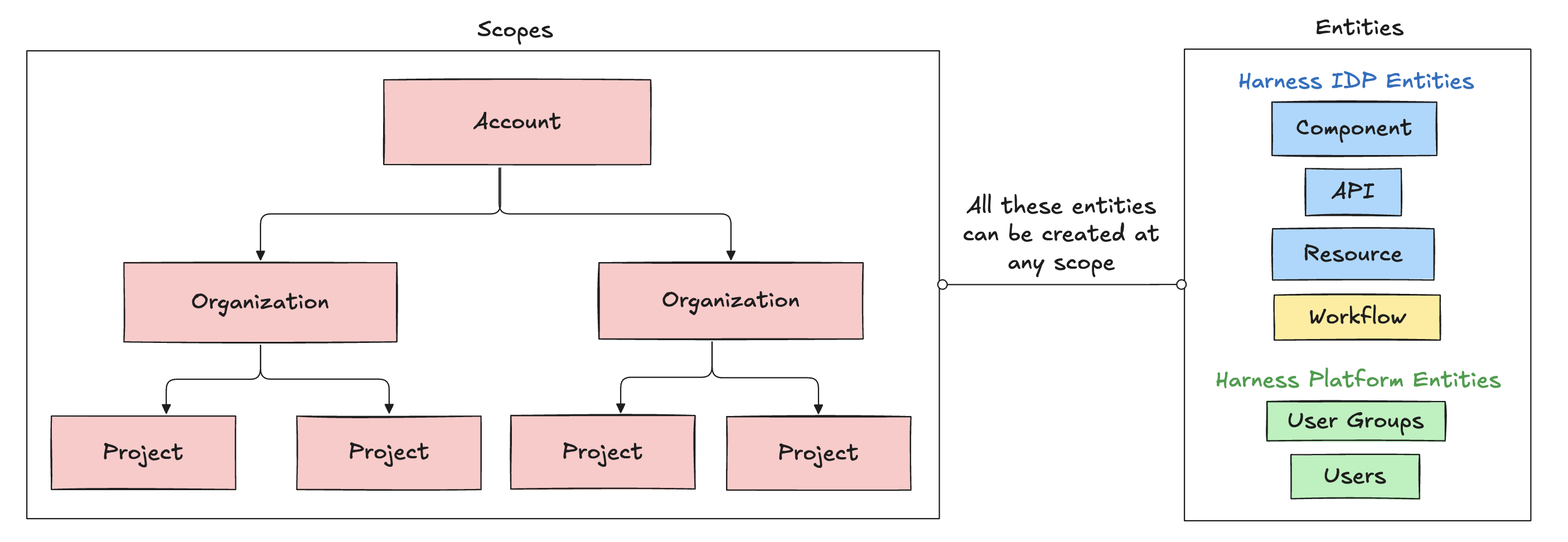 Let's dive deeper into how entities and scopes come together in the Harness-native data model.