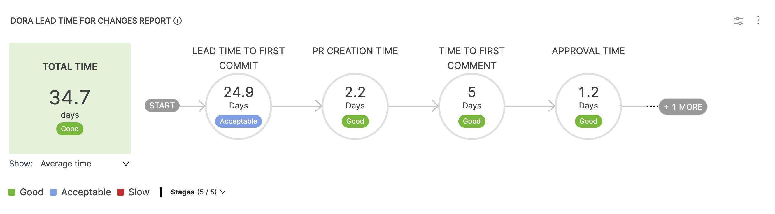 Overall lead time is the sum of the time spent in each stage in a workflow, such as commit-to-deployment time for a change, open-to-merge time for PRs, or the issue workflow for issues in your issue management system. Lead time can help identify where a team is spending time and if the amount of time spent in each stage falls in an acceptable range.
