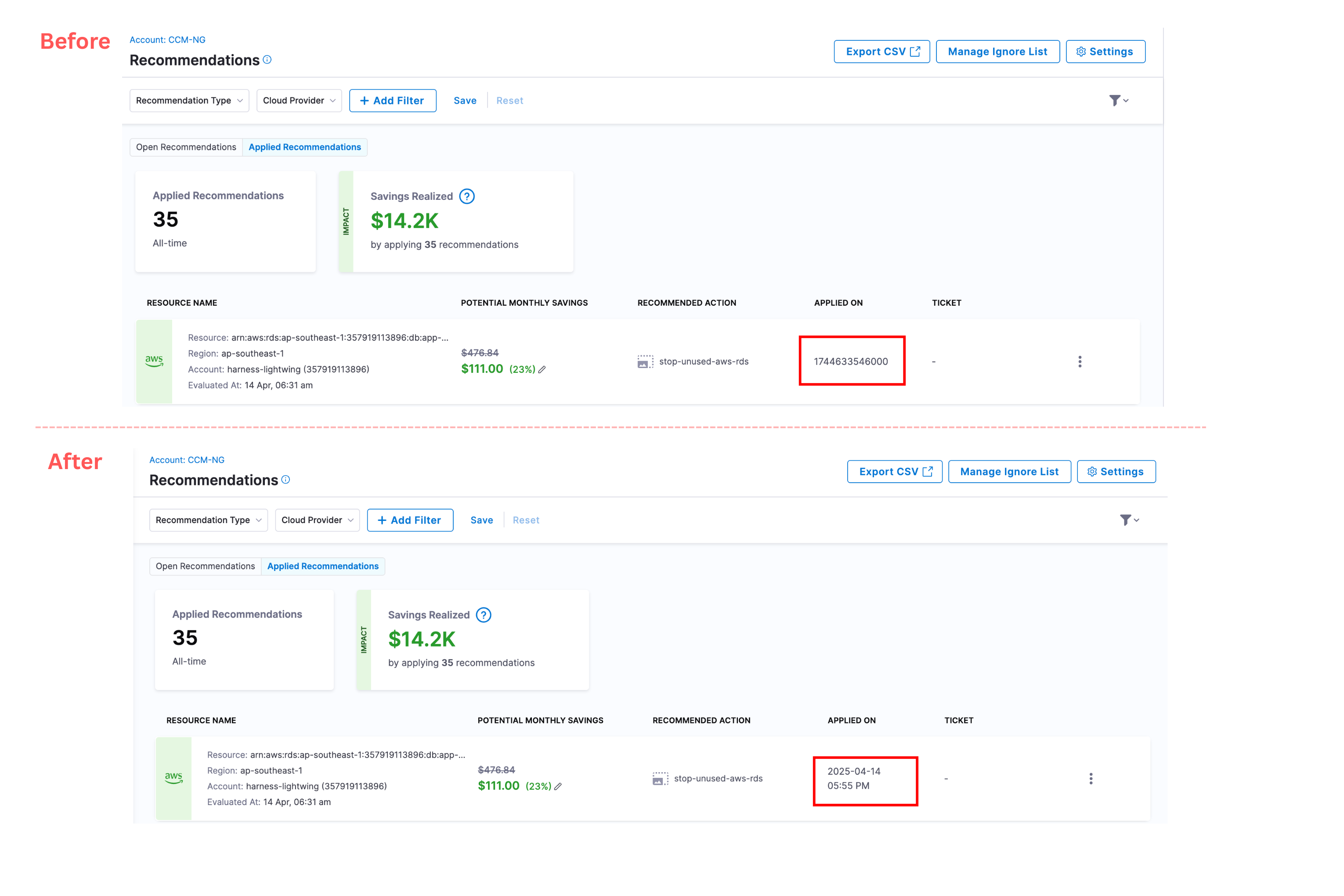 - Applied At: Date and time when the recommendation was applied (only for applied recommendations)