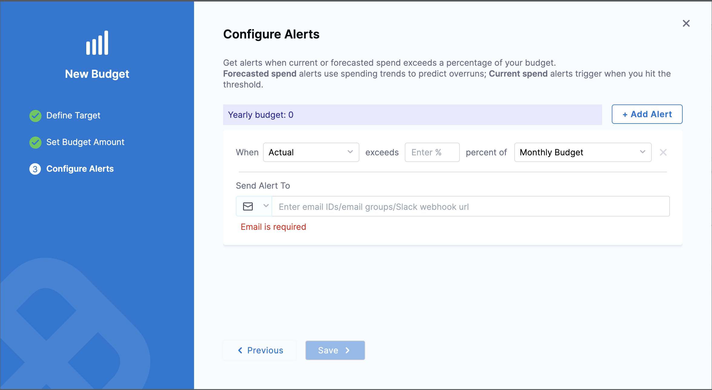 - Manage alerts across multiple budgets (add/remove recipients, delete alerts)